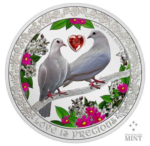 The striking Love is Precious - Doves 1oz Silver Coin features two white Doves, representing lovers, perched together on a branch, and surrounded by beautiful blossoms. Between them is a red heartshaped cubic zirconia, set into the coin. Around the edge, the inscription Love is Precious is finely engraved into an ornate border.
