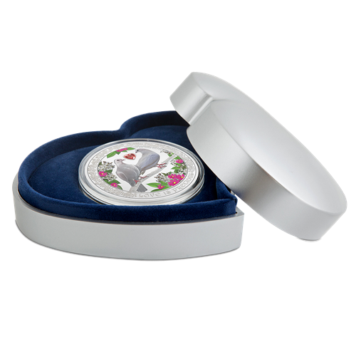 To make this a truly special gift, this pure silver coin arrives in a quality gift box, featuring complementary colours and dove motifs, which opens to reveal an elegant heart-shaped silver coloured coin case. A Certificate of Authenticity is placed inside and features the Arrigo Boito quote: “When I saw you, I fell in love, and you smiled because you knew.”