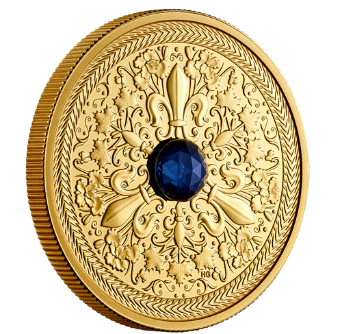 The stunning blue sapphire on this 99.99% pure gold coin is sure to spark joy.