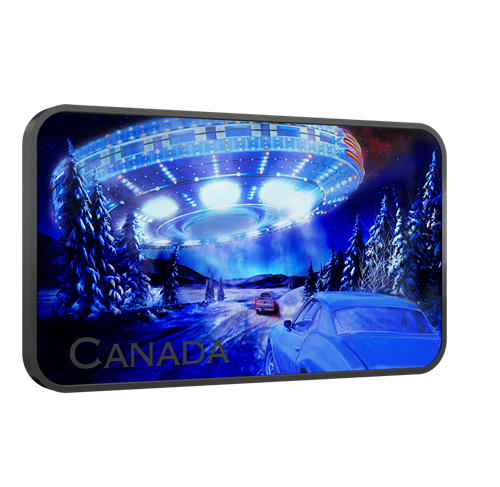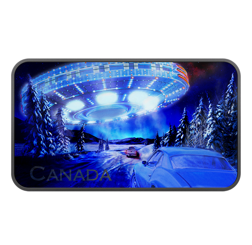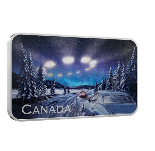 Imagine driving on a snowy highway at night and seeing a row of lights in the sky… and you suddenly realize it’s a giant UFO! This is the scene depicted on our fifth Canada’s Unexplained Phenomena coin, which tells the story of a UFO encounter in the Yukon. On the night of December 11, 1996, at least 31 people in four different areas reported seeing a UFO in the sky. The bright lights described by the witnesses have been re-created on this rectangular coin’s reverse, where a more complete picture of the giant UFO comes into view when the black light paint technology is activated.