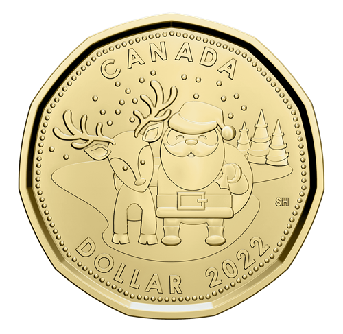 Features a specially struck $1 piece that is only available as part of this gift card set. Designed by Canadian artist Steve Hepburn, the dollar coin’s holiday-themed reverse features a whimsical portrait of Santa with a reindeer (known as caribou in Canada).