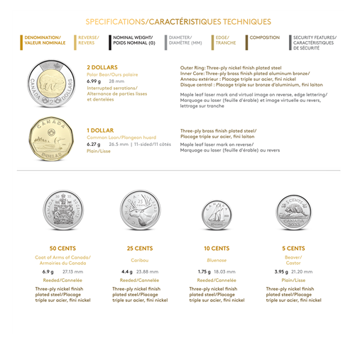 Les pièces de circulation canadiennes 2022 sont enfin là! Cet ensemble annuel contient nos six pièces de circulation aux motifs classiques, dont la pièce de 50 cents, ornée des armoiries du pays. De l’ours polaire au castor, les symboles du Canada qui figurent encore aujourd’hui sur nos pièces, initialement des hommages, sont devenus de véritables emblèmes intemporels.