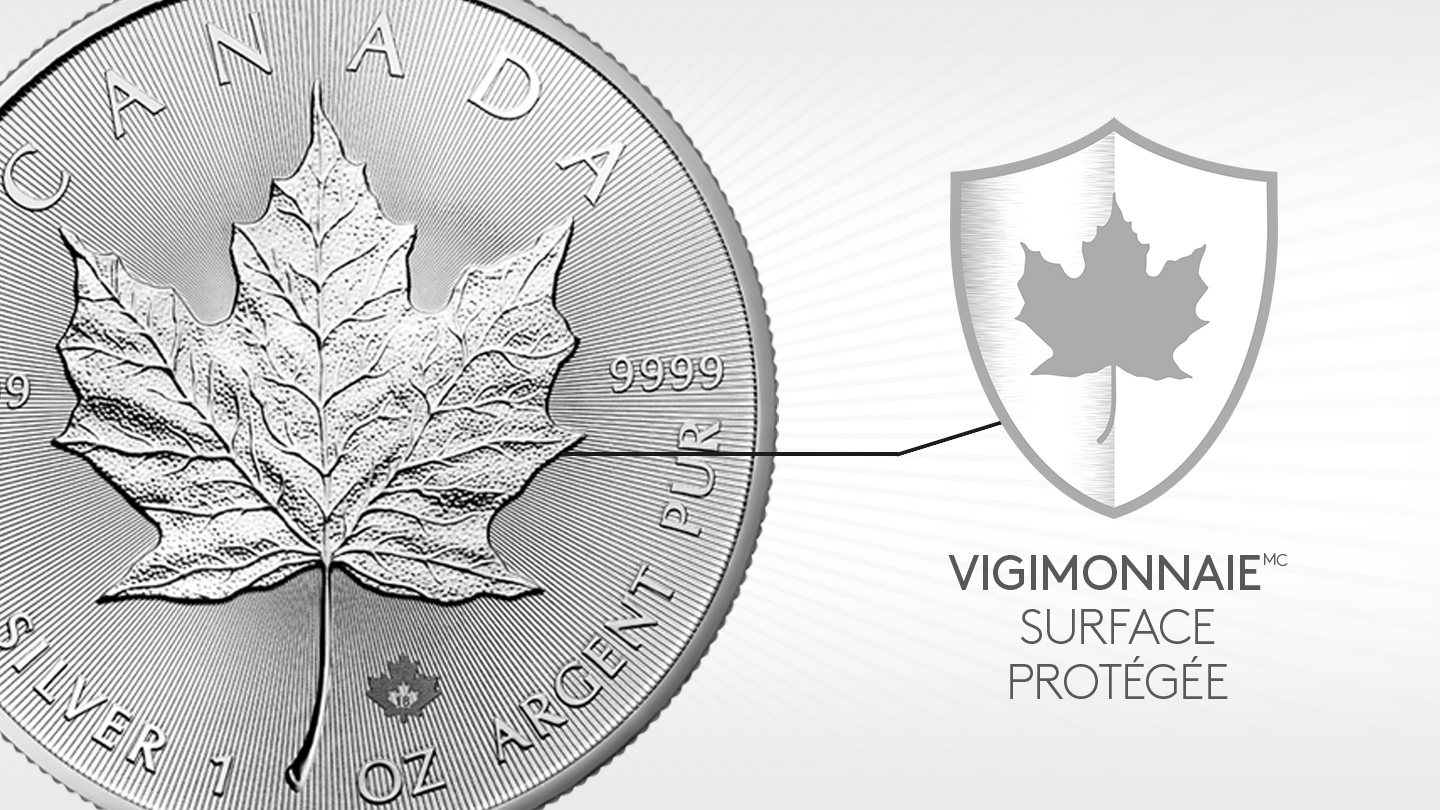 Depuis 2018, toutes nos pièces Feuille d’érable en argent sont protégées à l’aide du procédé VIGIMONNAIEMC, la seule et unique solution éprouvée qui réduit l’apparition de taches blanches sur les pièces d’investissement en argent – une première dans le monde.