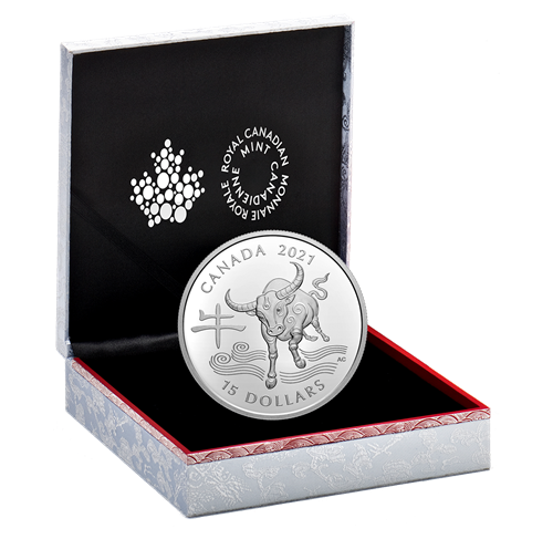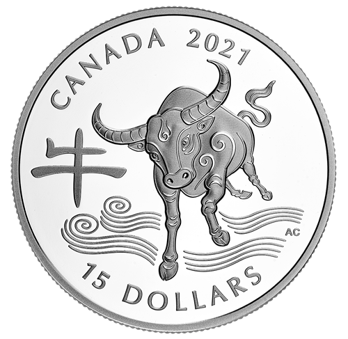 L'artiste canadien Aries Cheung a créé une représentation stylisée d'un bœuf fonçant droit sur son caractère chinois, situé à sa gauche. Les sabots de l'animal soulèvent la poussière, qui se transforme en nuages de bon augure dont les volutes font écho aux gravures sur son flanc. L'avers est à l'effigie de Sa Majesté la reine Elizabeth II, selon Susanna Blunt.