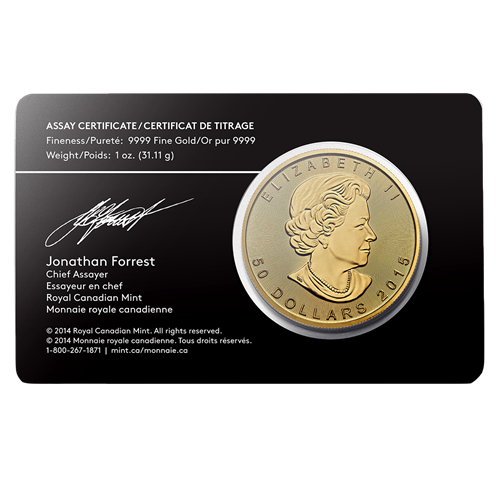 - Certificat de titrage figurant au dos de la carte signé par l'essayeur en chef de la Monnaie royale canadienne attestant l'authenticité et le degré de pureté de chaque pièce d'investissement Feuille d'érable en or.