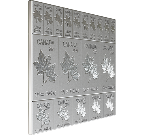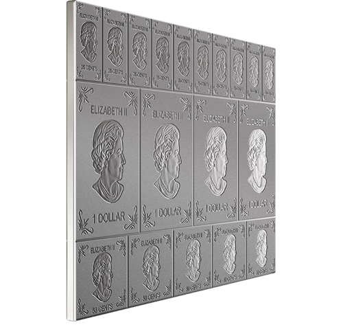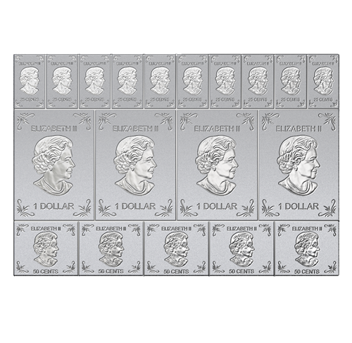 La Monnaie royale canadienne atteint une fois de plus de nouveaux sommets avec un chef-d’œuvre original. La plaquette FLEXIPIÈCEMC ayant cours légal est constituée de 19 pièces de divers poids et valeurs nominales qui totalisent deux onces d’argent. Elle compte dix pièces de 1/20 oz, quatre pièces de 1/4 oz et cinq pièces de 1/10 oz. Les valeurs nominales correspondantes de 25 cents, de 50 cents et de 1 dollar sont gravées à l’avers respectif de chaque pièce.