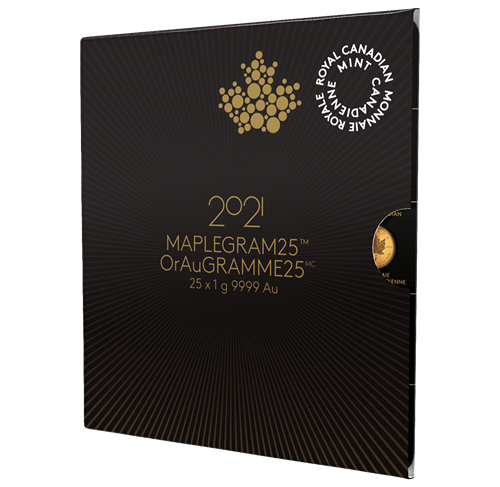 La Monnaie royale canadienne est fière de lancer le produit OrAuGRAMME25MC 2021, un ensemble de 25 pièces FÉO présentées dans un emballage-coque divisible que protège une élégante pochette. L’emballage-coque de chacune des pièces de un gramme en or pur à 99,99 % possède un numéro de série distinct. Sur la pochette, le certificat de titrage atteste le degré de pureté et le poids des pièces.