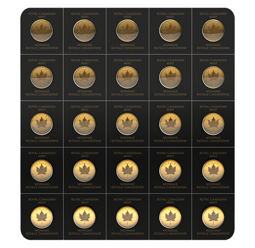 - Emballage-coque divisible contenant 25 pièces Feuille d’érable en or de un gramme ayant cours légal.